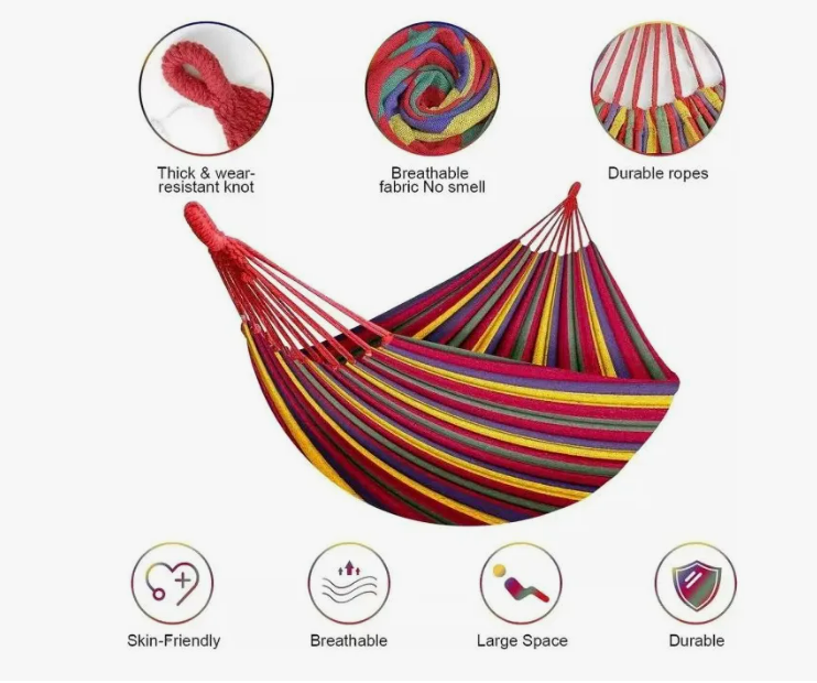 Disfruta de momentos de relax y confort con nuestra hamaca multicolor. Perfecta para descansar en el jardín, en la playa o en el camping, esta hamaca ofrece un amplio espacio para que te acomodes y te relajes.