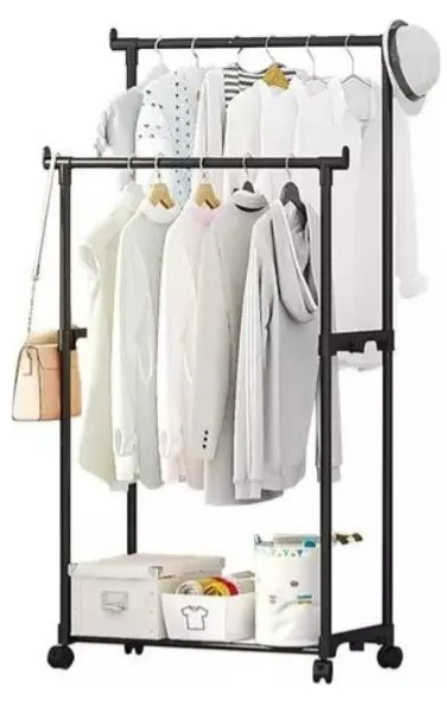 Este perchero cuenta con barras colgantes altas y bajas para acomodar ropa de diferentes longitudes, lo que facilita la organización diaria. Los rieles laterales ofrecen almacenamiento adicional para perchas, bufandas y toallas.